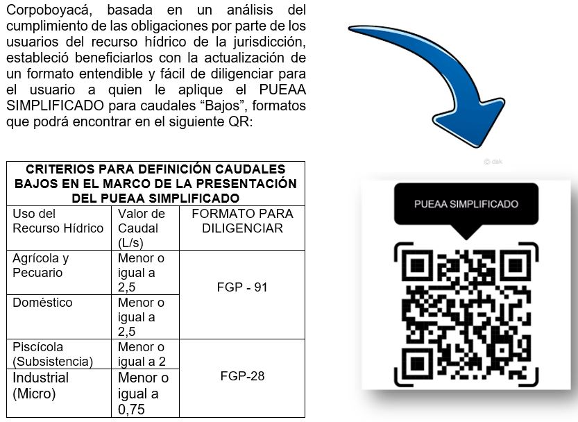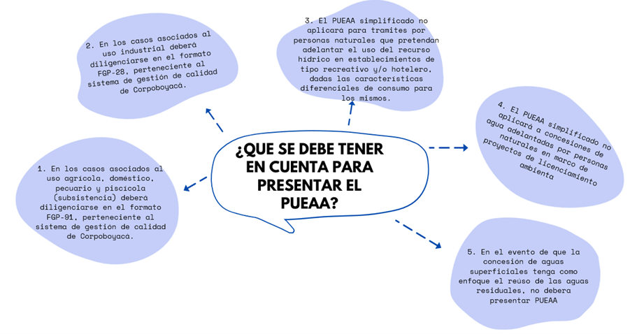 Para caudales mayores a los mencionados anteriormente u otros usos del recurso hídrico, deberá elaborarse el documento PUEAA de acuerdo con los términos de referencia de Corpoboyacá.