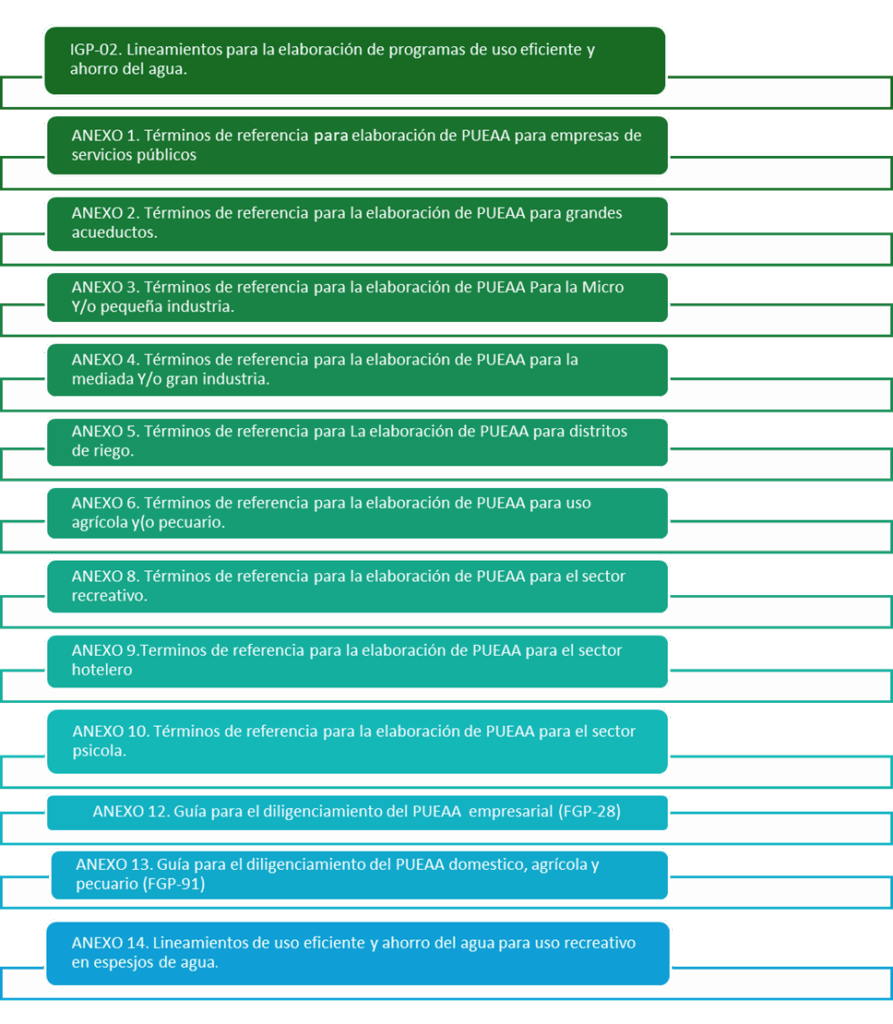 Resolución No. 1257 de 2018 | Establece la estructura y contenido del Programa de Uso y Ahorro Eficiente del Agua Simplificado, el cual deberá contener Información general, Diagnóstico, Objetivos, Plan de Acción (estructurado a partir del diagnóstico incluyendo la definición y descripción de los proyectos, actividades, metas, indicadores y presupuesto para implementar el uso eficiente y ahorro de agua Enlace: https://www.minambiente.gov.co/wp-content/uploads/2021/08/resolucion-1257-de-2018.pdf |
