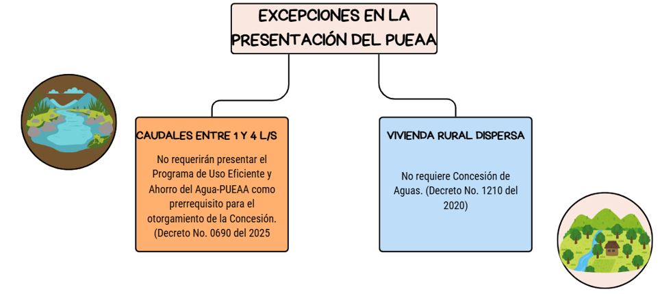 USO EFICIENTE Y AHORRO DEL AGUA Uso eficiente y ahorro del agua (UEAA). Es toda acción que minimice el consumo de agua, reduzca el desperdicio u optimice la cantidad de agua a usar en un proyecto, obra o actividad, mediante la implementación de prácticas como el reúso, la recirculación, el uso de aguas lluvias, el control de pérdidas, la reconversión de tecnologías o cualquier otra práctica orientada al uso sostenible del agua. Artículo 2.2.3.2.1.1.2, Decreto 1090 de 2018. | PROGRAMA DE USO EFICIENTE Y AHORRO DEL AGUA Programa para el uso eficiente y ahorro del agua (PUEAA) es una herramienta enfocada a la optimización del uso del recurso hídrico, conformado por el conjunto de proyectos y acciones que le corresponde elaborar y adoptar a los usuarios que soliciten concesión de aguas, con el propósito de contribuir a la sostenibilidad de este recurso. Artículo 2.2.3.2.1.1.3. , Decreto 1090 de 2018. |