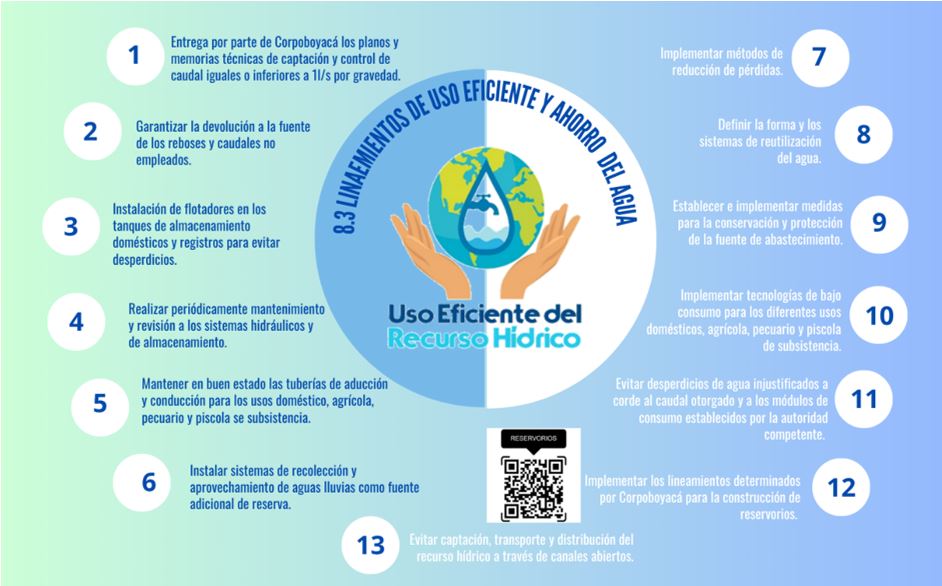 Conforme a lo anterior, mediante estos lineamientos Corpoboyacá pretende establecer parámetros básicos a tener en cuenta durante el proceso de ubicación, construcción, mantenimiento y limpieza de reservorios, con el propósito de contar con insumos técnicos para el desarrollo estructurado en este tipo de proyectos y a la vez proveer de información a los municipios de la jurisdicción, buscando que este tipo de estructuras sean adecuadas para almacenar los excedentes de agua generados en tiempos de lluvias, para ser utilizados en temporadas secas, siendo un instrumento integral de autogestión del recurso hídrico para uso y aprovechamiento eficiente del agua como medida de adaptación al cambio climático, evitando afectación ambiental a fuentes hídricas y problemas de inestabilidad del terreno que desencadenan conflictos socio ambientales en las comunidades.