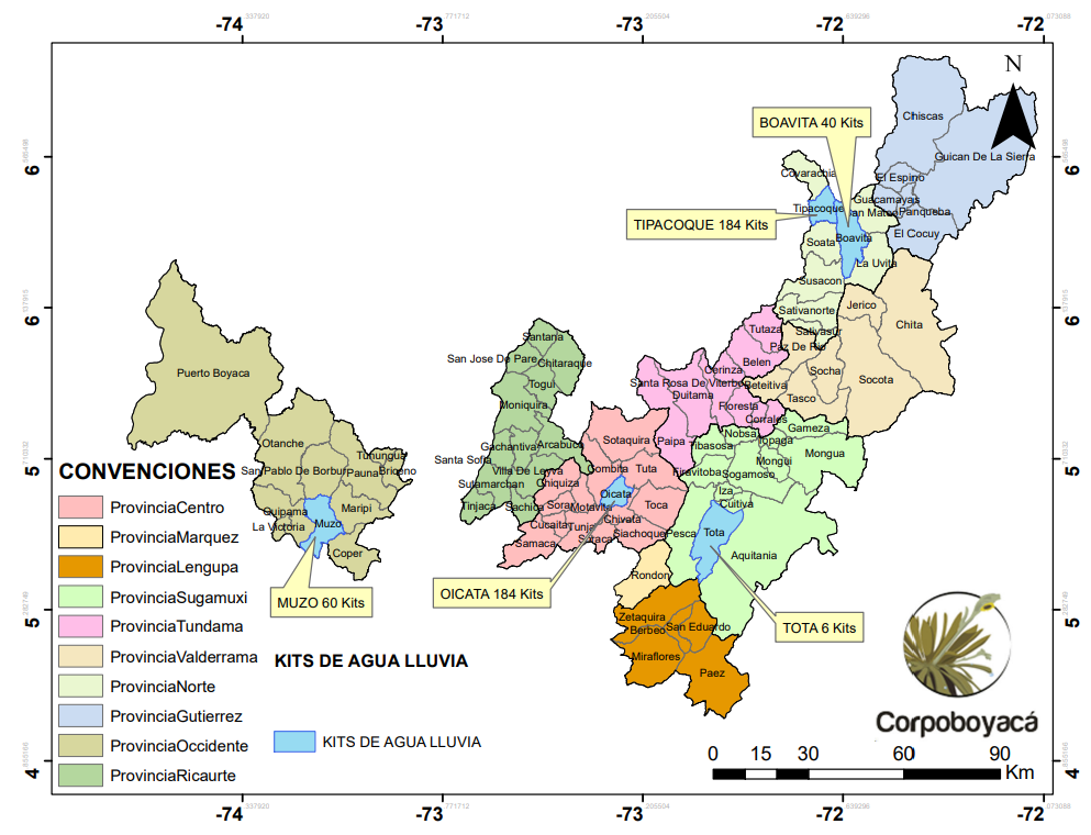 En el departamento de Boyacá se han instalado KITS de recolección de agua lluvia en las zonas rurales de los municipios entre los cuales están Oicata, Boavita, Tota, Tipacoque y Muzo, enfocados en proporcionar soluciones sostenibles para captar y almacenar agua de lluvia.