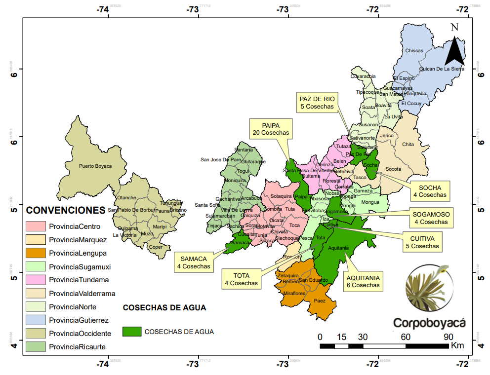 En el departamento de Boyacá se han ejecutado proyectos de cosechas de agua en 12 municipios de la jurisdicción de Corpoboyacá, entre los que están Paipa, Paz de Río, Socha, Sogamoso, Cuítiva, Aquitania, Tota y Samacá.