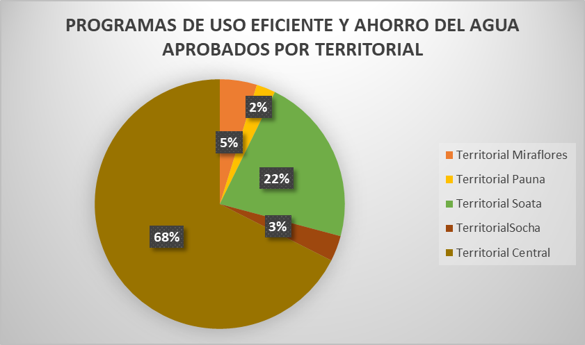 Actualmente hay 831 PUEAA aprobados en Corpoboyacá de los cuales fueron aprobados 549 en la oficina principal de Tunja, 178 en la oficina Territorial Soata, 39 en la oficina Territorial de Miraflores, 27 en la Oficina Territorial de Socha y 20 en la oficina Territorial de Pauna (incluyendo perímetros urbanos), como se evidencia en la siguiente grafica.