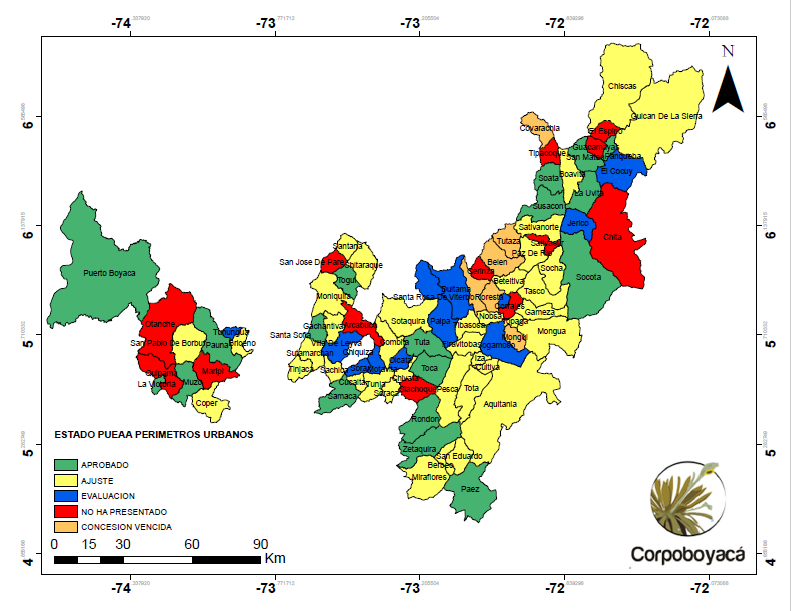 De los 87 municipios en jurisdicción de Corpoboyacá 73 presentaron documento PUEAA (programa de uso eficiente y ahorro del agua), de los cuales 18 fueron aprobados y acogidos mediante acto administrativo, 16 aún se encuentran en evaluación por parte de la Corporación, 36 no aprobados que se encuentran en ajustes por parte de las administraciones y 4 municipios con concesiones vencidas y en estado de renovación