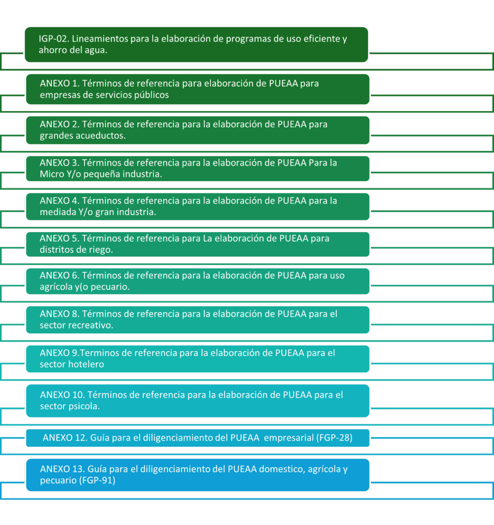 El Gobierno Nacional a través de la expedición de la Ley 373 de 1997 establece que las Autoridades Ambientales aprobaran la formulación del “Programa de Uso Eficiente y Ahorro del Agua (PUEAA)”, el cual busca identificar las acciones para reducir y optimizar la cantidad de agua usada en todo tipo de procesos y actividades, mediante la implementación de prácticas como el reúso, la recirculación, uso de aguas lluvias, control de pérdidas, tecnologías de bajo consumo de agua, entre otras prácticas de aprovechamiento sostenible del agua. Estos programas deben ser formulados y ejecutados en un horizonte de cinco (5) años, por las entidades encargadas de la prestación de los servicios de acueducto, alcantarillado, riego y drenaje, producción hidroeléctrica y demás usuarios del recurso hídrico que soliciten concesiones de agua.